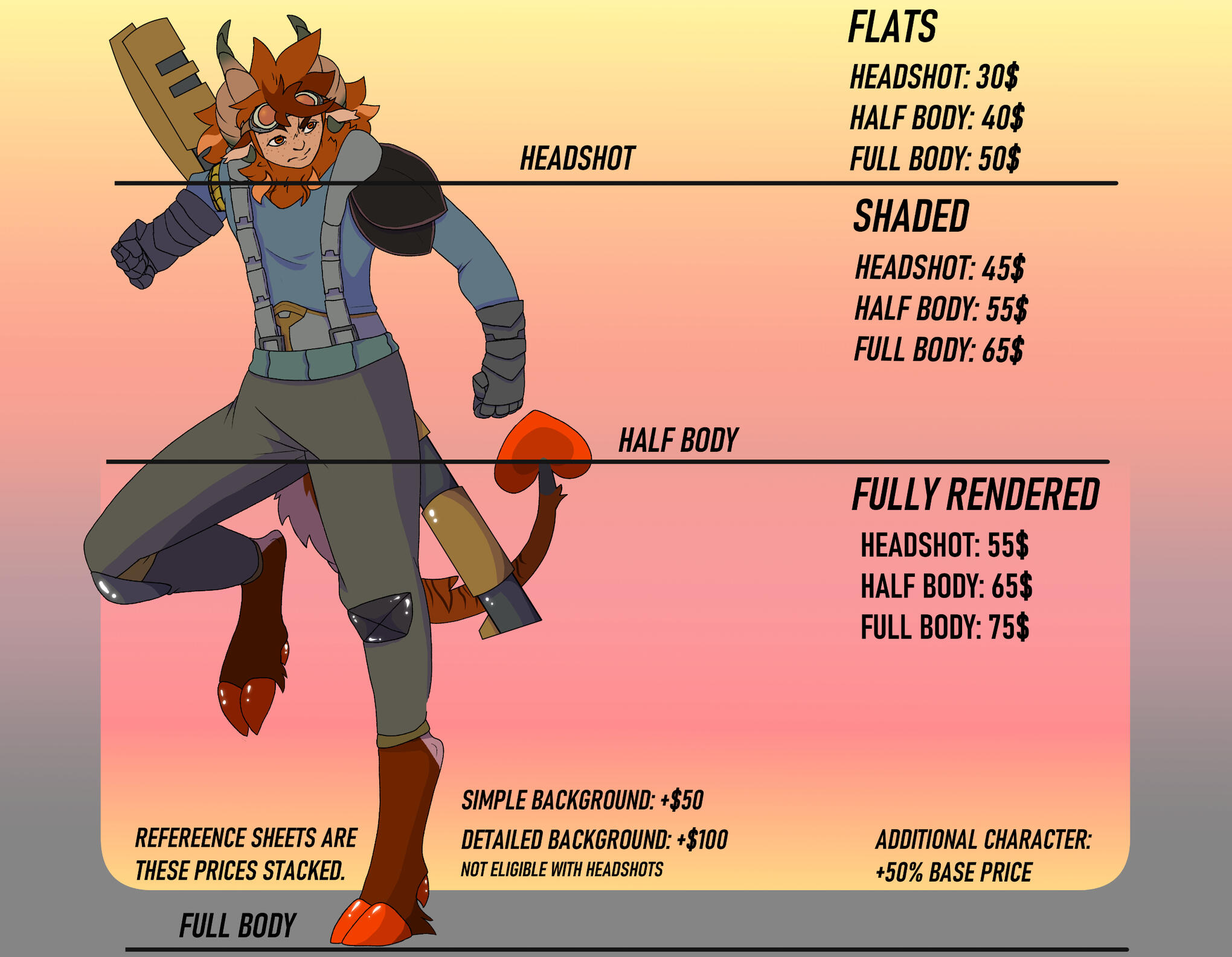 — A clear reference sheet must be provided. A 50% upcharge will be given if none is provided (this excludes reference sheet commissions)
